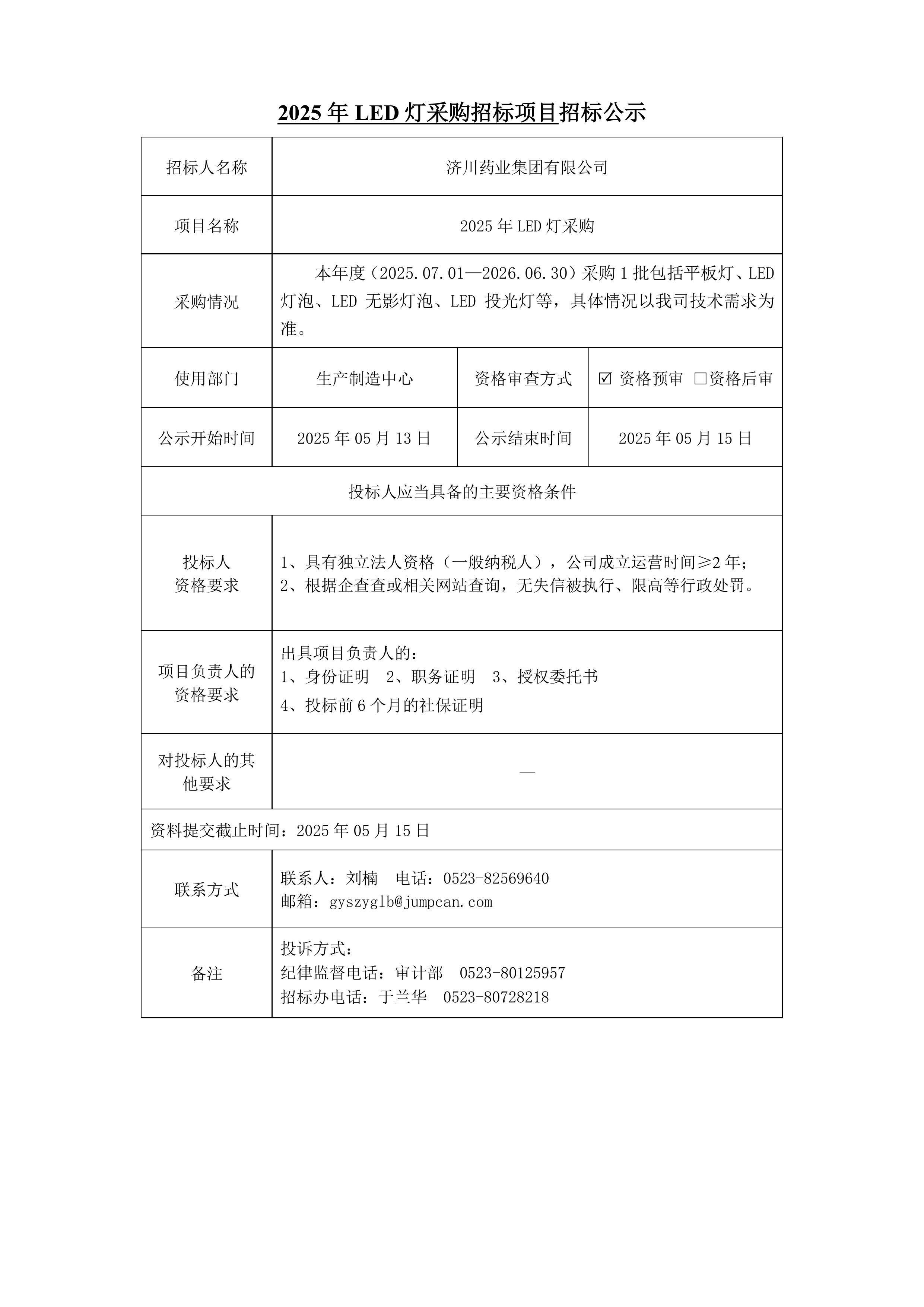 2025年LED灯采购招标项目招标公示