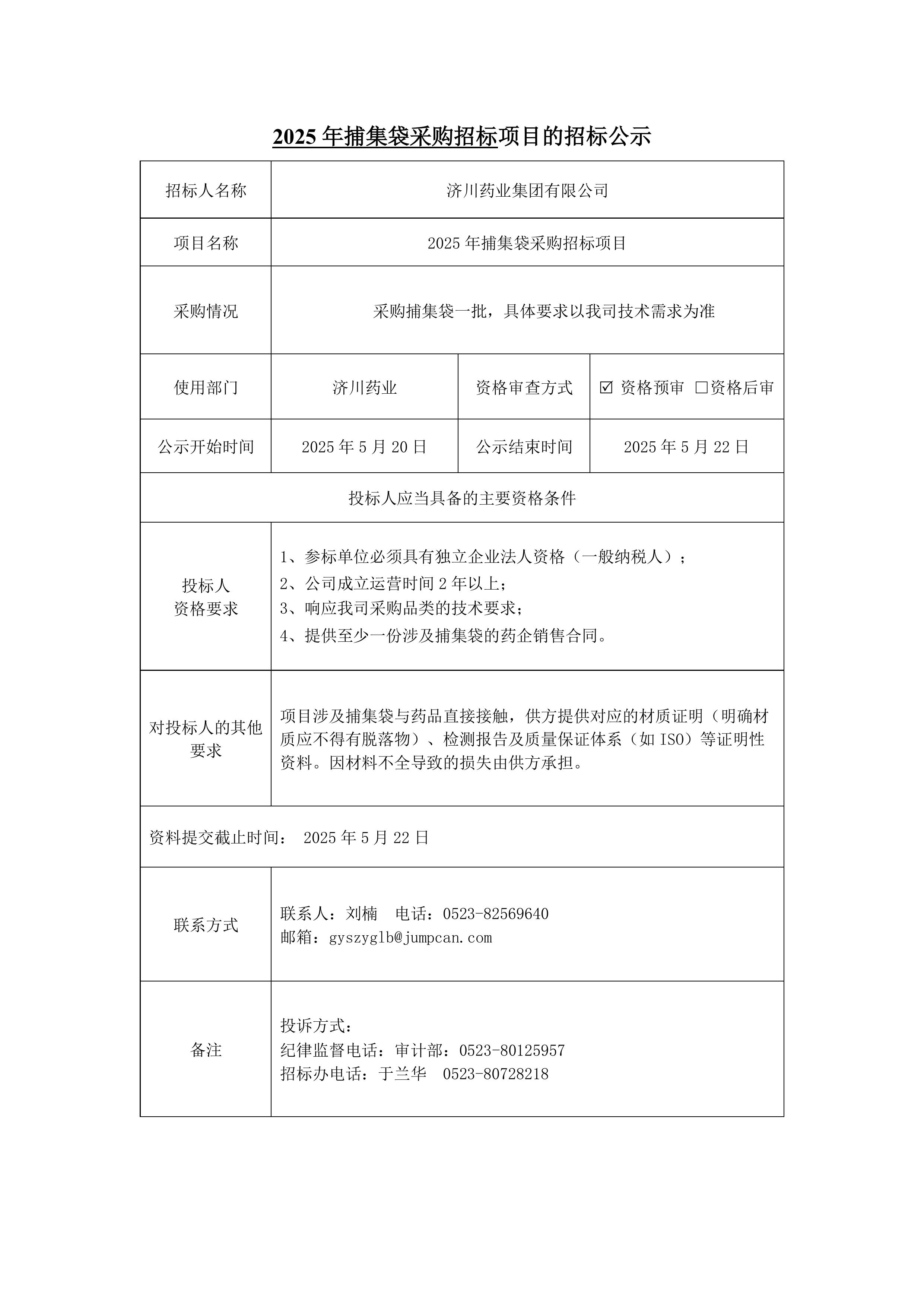 2025年捕集袋采购招标项目招标公示
