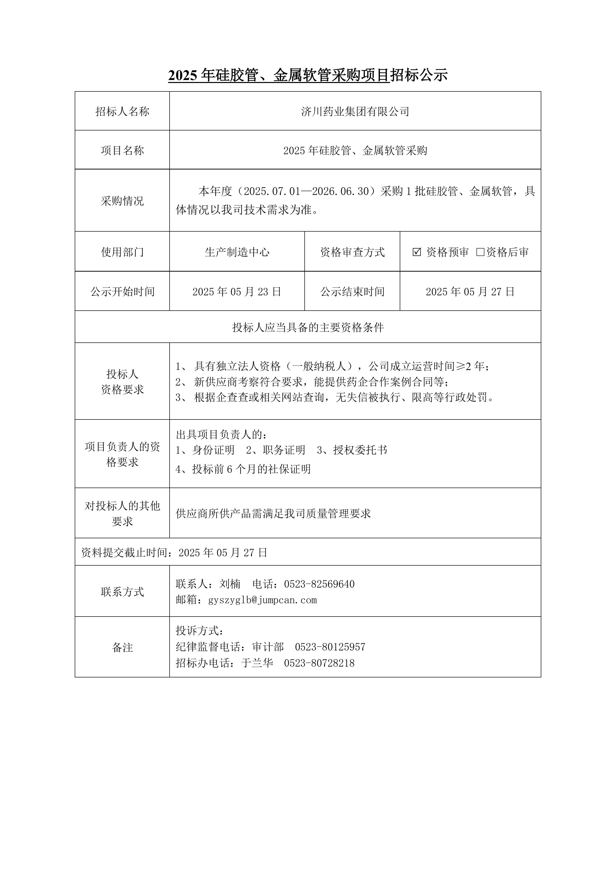 2025年硅胶管、金属软管采购招标项目招标公示