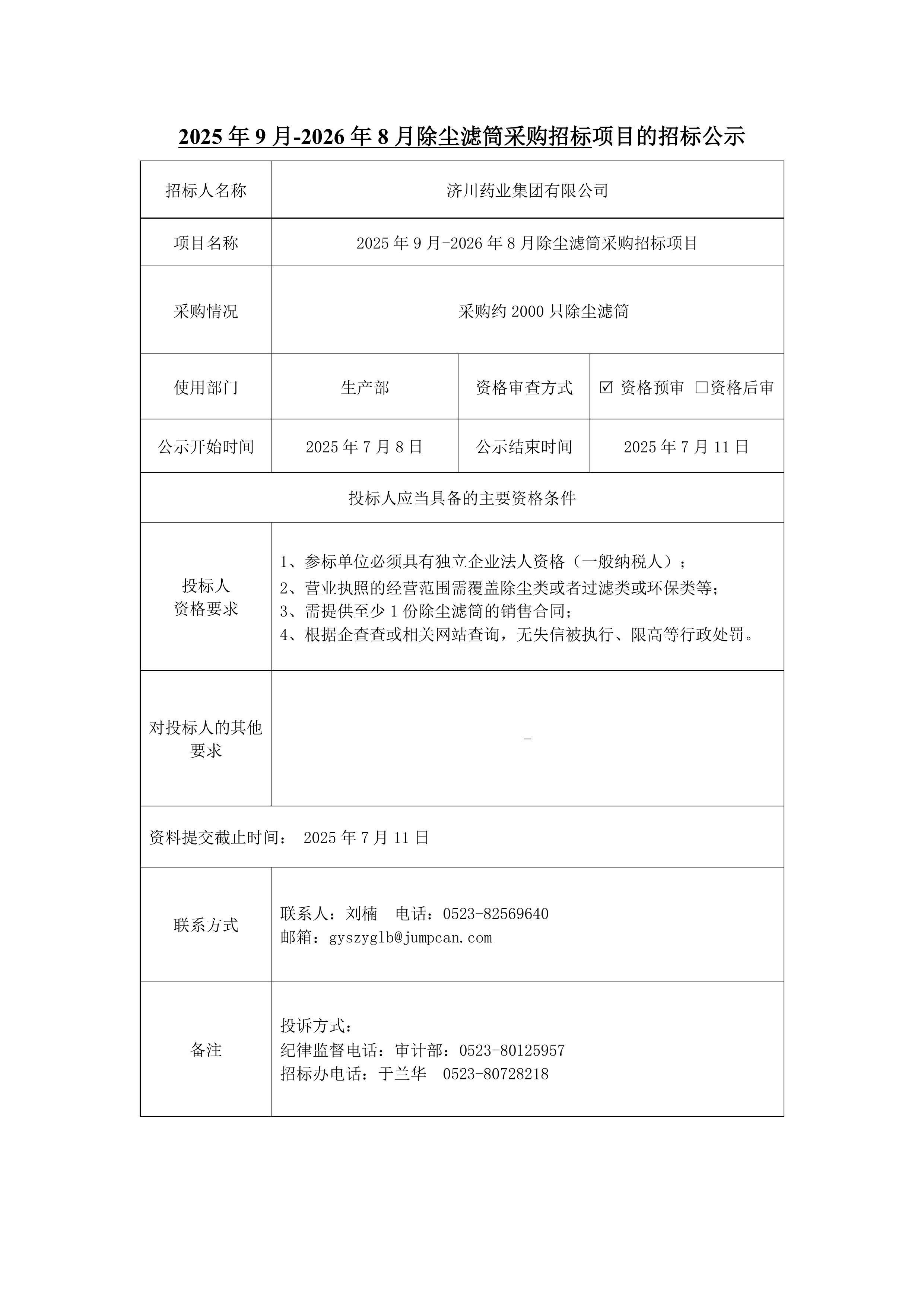 2025年9月-2026年8月除尘滤筒采购招标项目招标公示