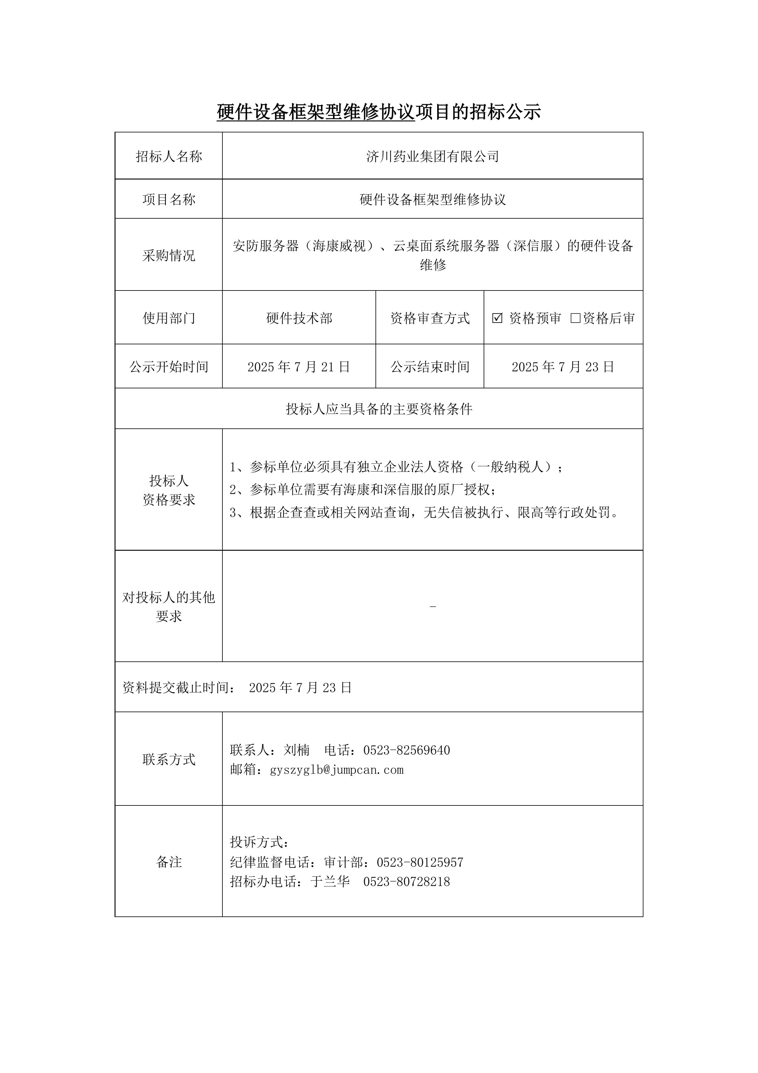 硬件设备框架型维修协议招标项目招标公示