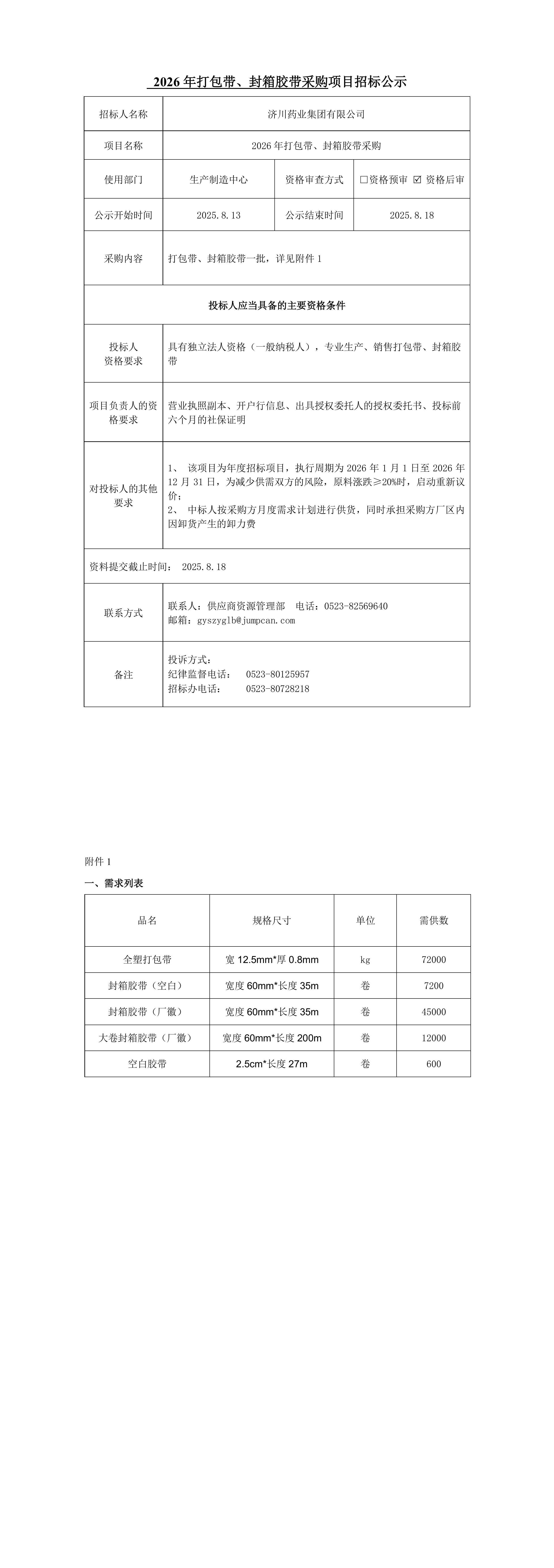 2026年打包带、封箱胶带采购项目招标公示