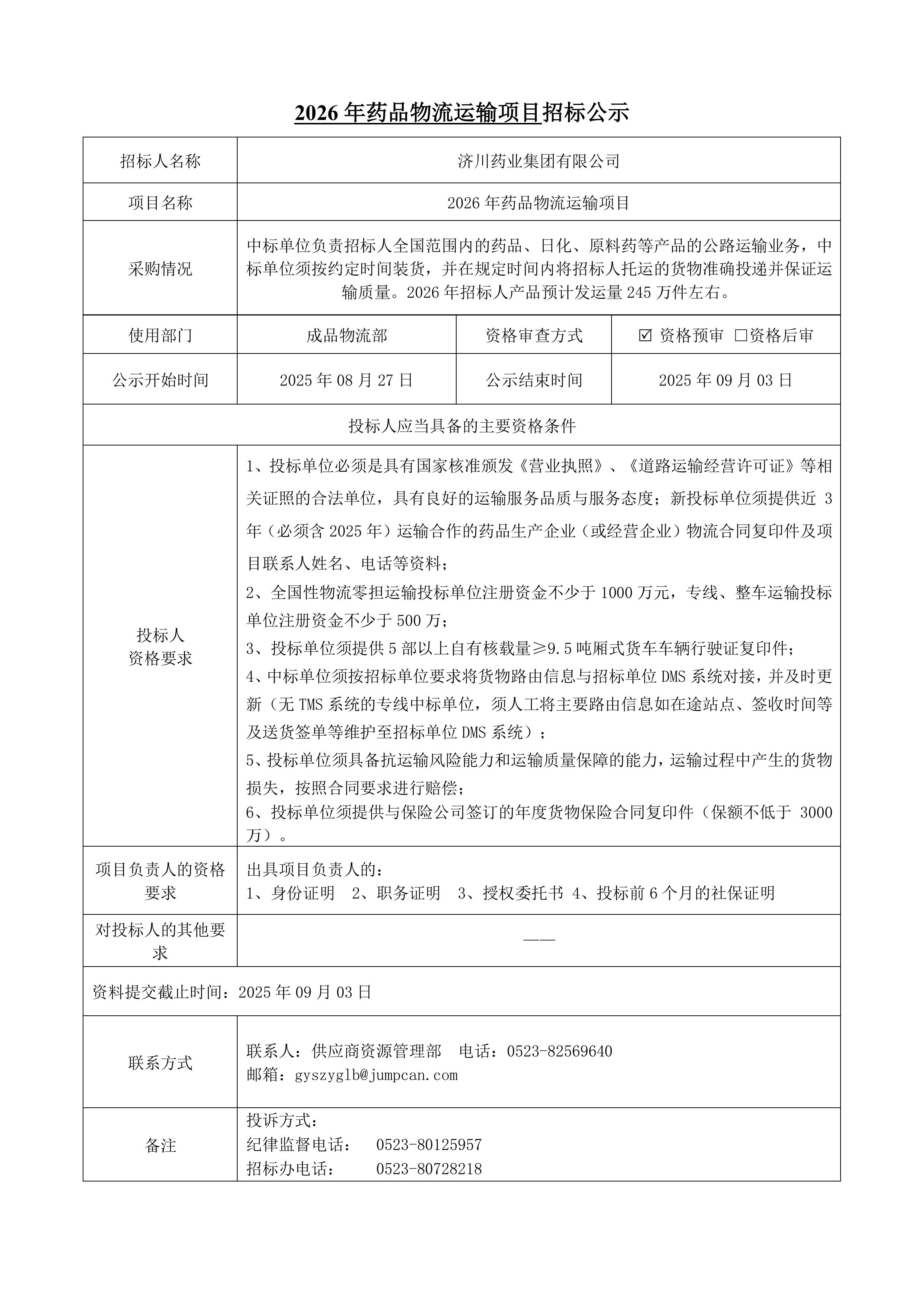 2026年药品物流运输项目招标公示