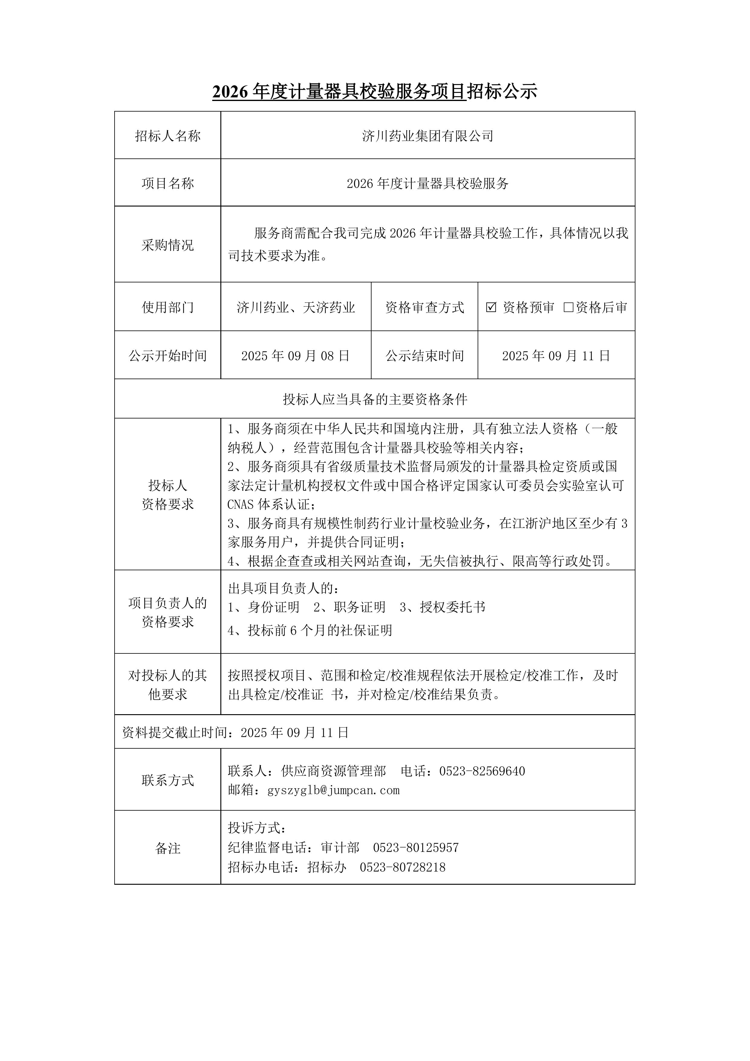 2026年度计量器具校验服务招标公示