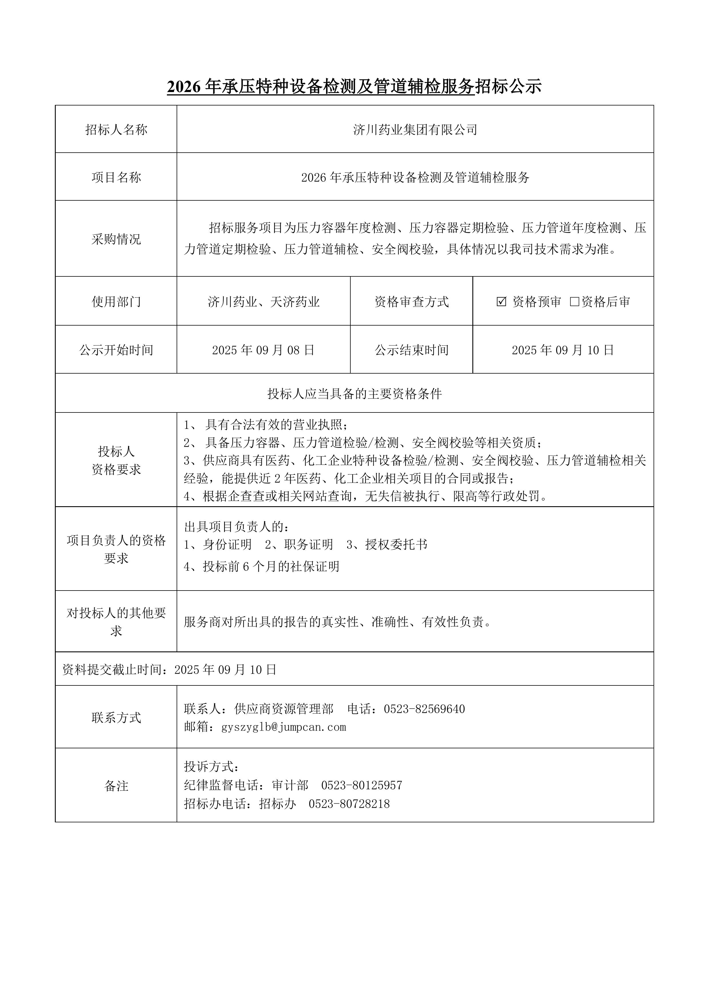 2026年承压特种设备检测及管道辅检服务招标公示