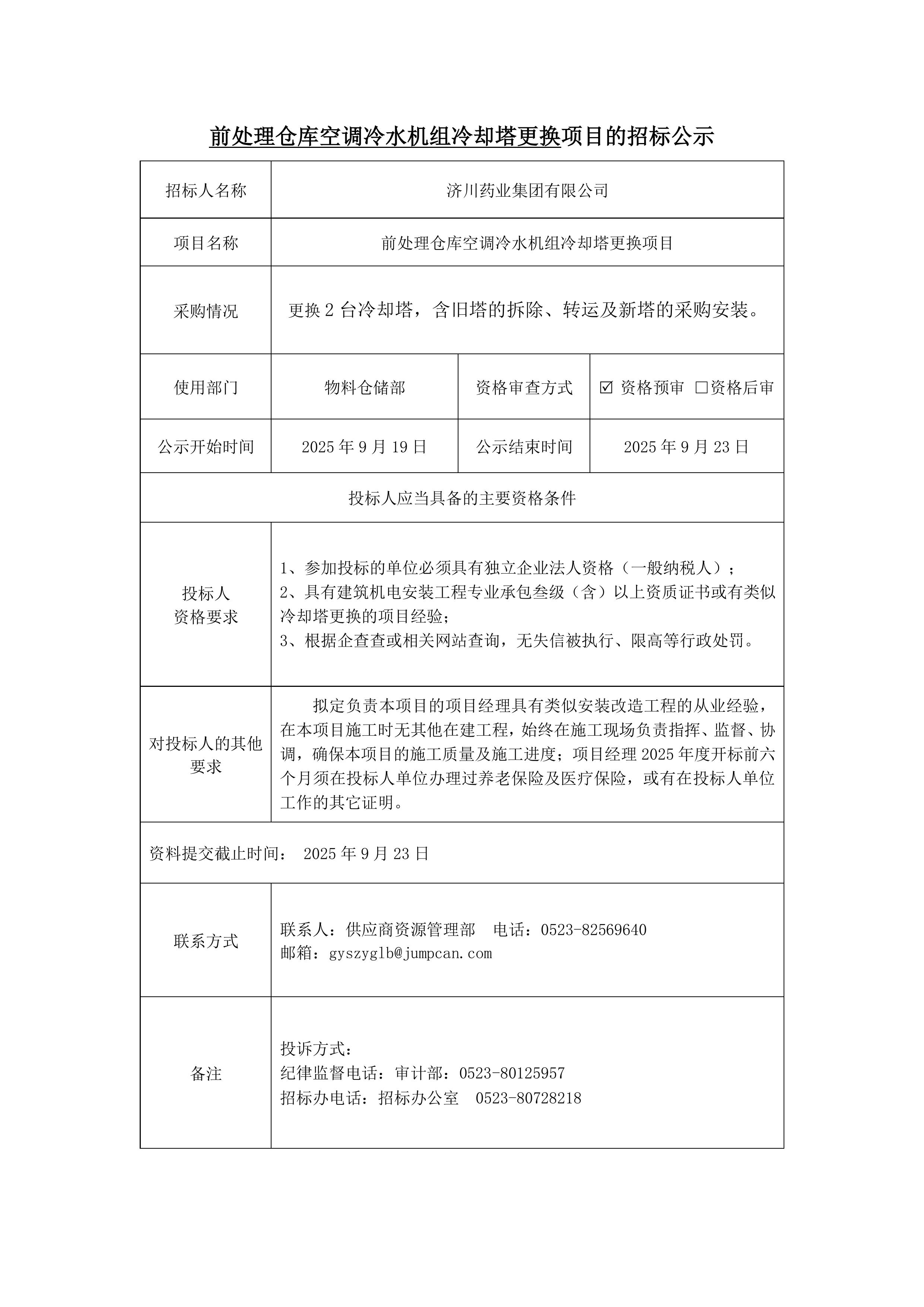 前处理仓库空调冷水机组冷却塔更换项目招标公示