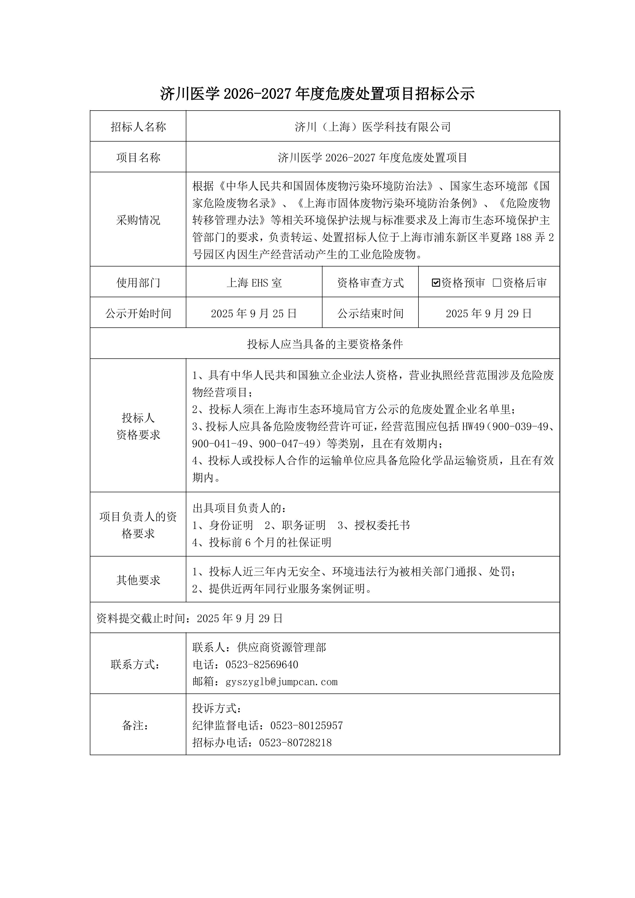 济川医学2026-2027年度危废处置项目招标公示