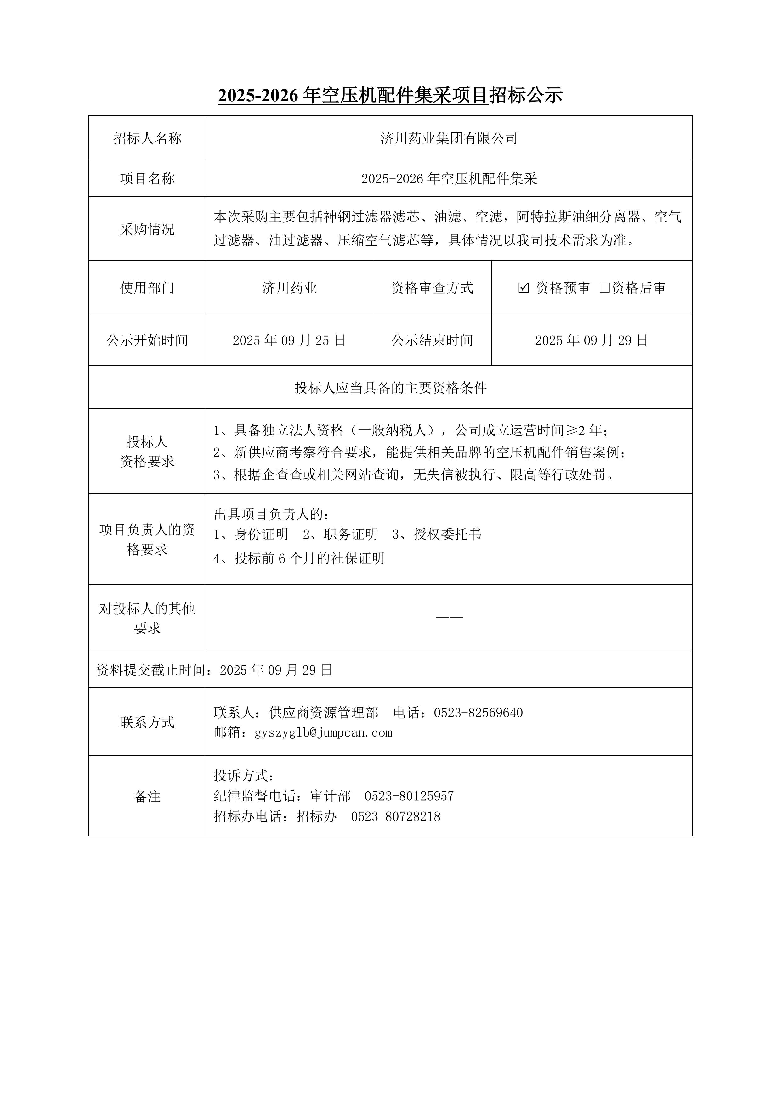 2025-2026年空压机配件集采项目招标公示