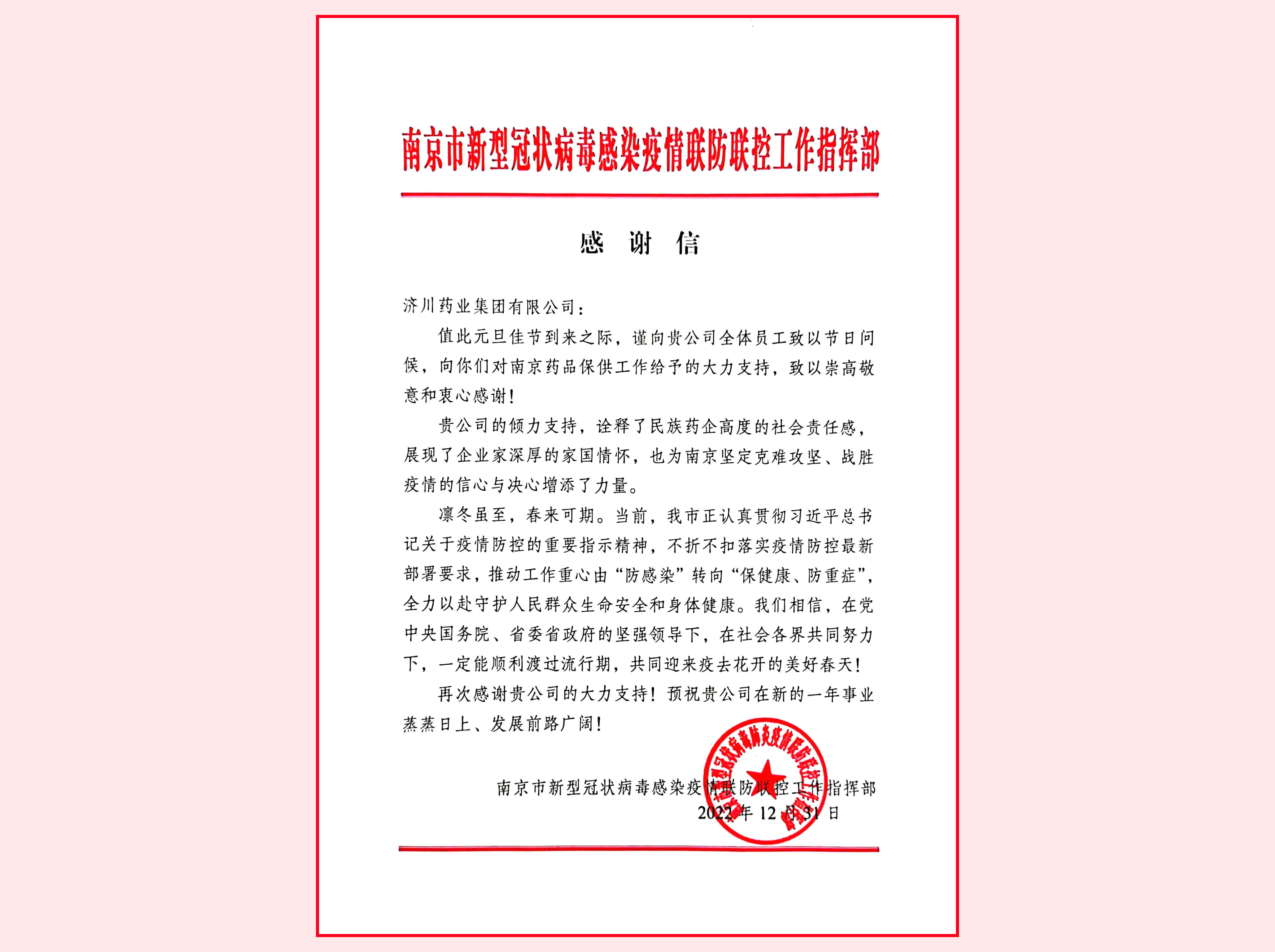 日前,济川药业集团收到来自南京市新型冠状病毒感染疫情联防联控工作指挥部的感谢信,对公司给予南京药品保供工作的大力支持表示感谢。据统计,仅12月20日至25日,济川药业向南京保供蒲地蓝消炎口服液7万多盒、小儿豉翘清热颗粒1万多盒。目前,企业把保供作为一项常态化工作来抓,努力缓解各地防疫药品紧缺局面。
