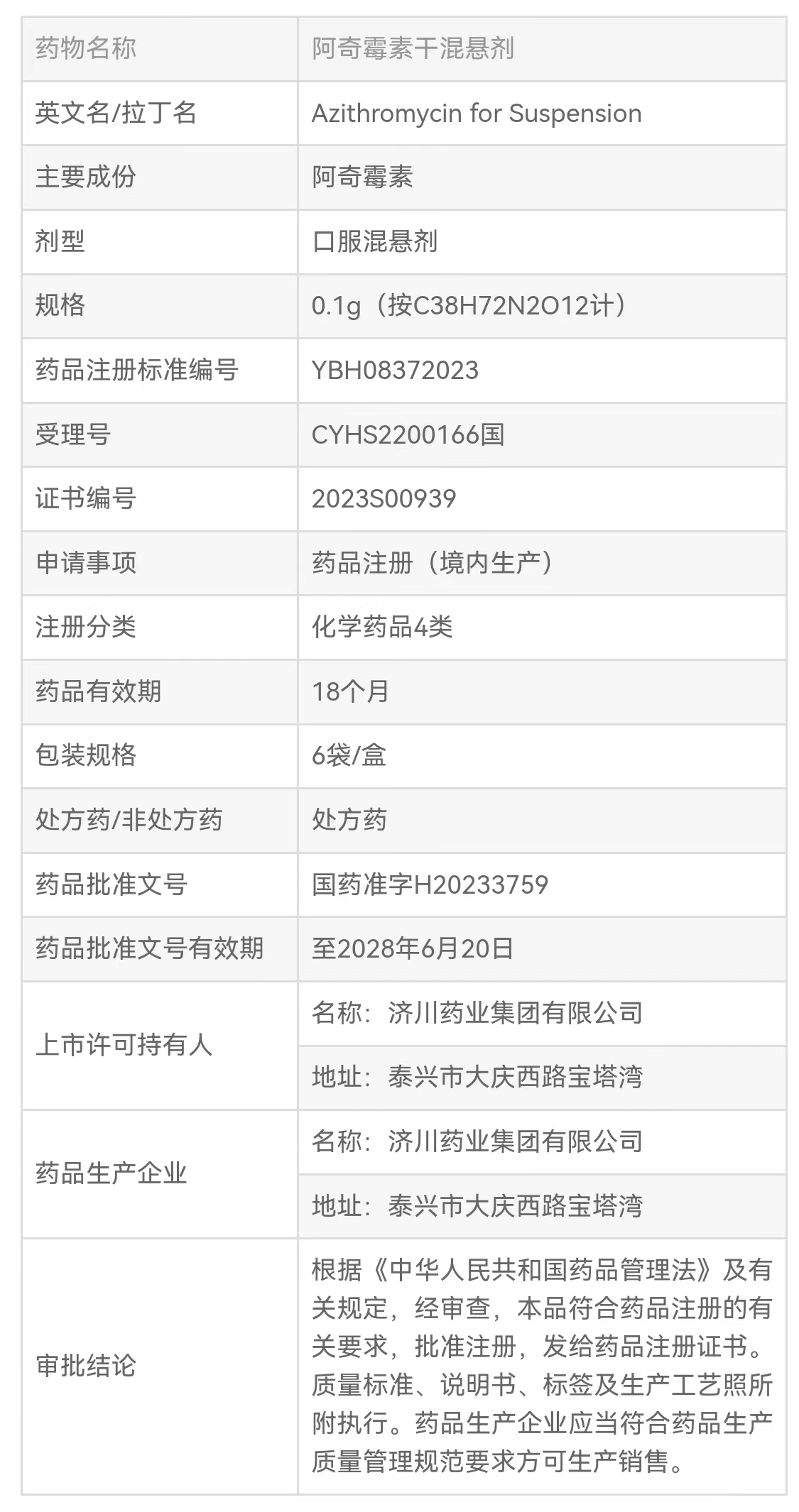 近日,济川药业收到国家药品监督管理局核准签发的阿奇霉素干混悬剂《药品注册证书》(证书编号:2023S00939)。该品种是大环内酯类抗菌药物,被纳入国家医保,已视同通过仿制药质量和疗效一致性评价。