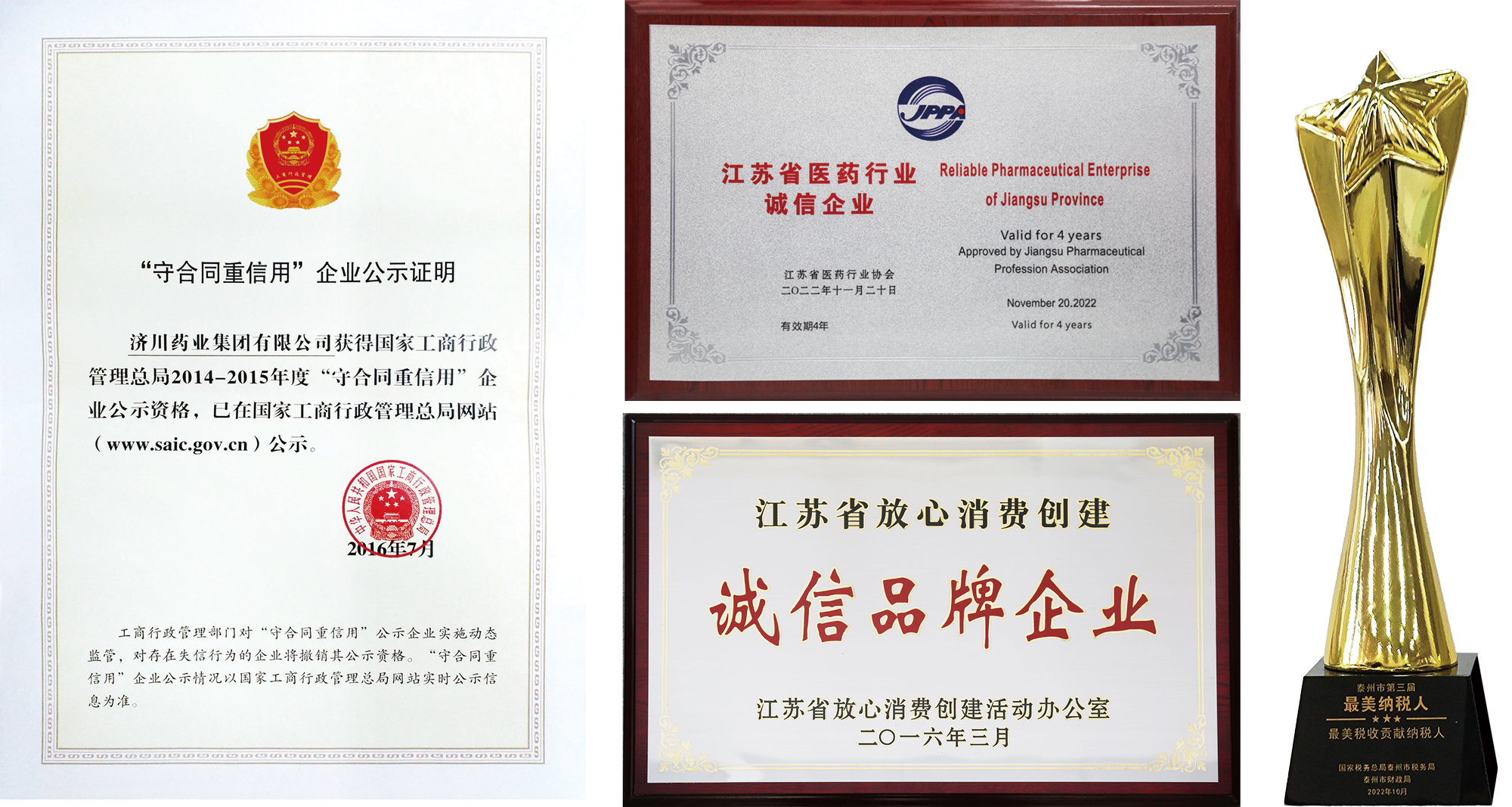 回首来路,济川药业奋战大健康的每一步都踏得坚定、坚实,收获良好经营业绩的同时,也收获政府、行业及消费者的一致肯定。公司先后获得了全国“守合同重信用”企业、“江苏省医药行业诚信企业”、江苏省消费者协会诚信单位、江苏省依法管理诚信经营企业、江苏省放心消费创建诚信品牌企业、“泰州最美纳税人”等诸多荣誉。